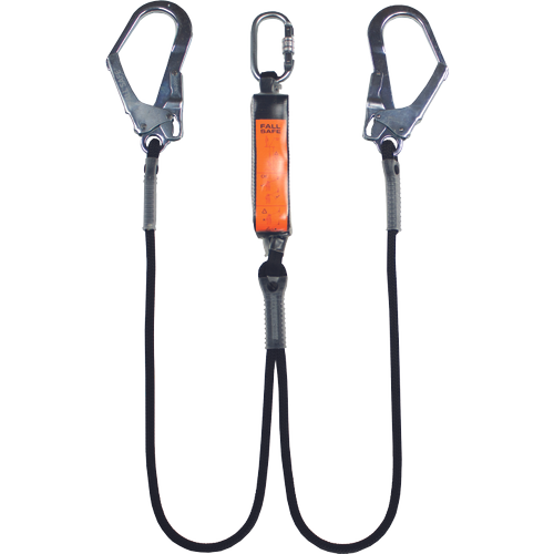 Fall safe shock absorber CHIMANGO 5 is a shock absorber with a connecting means of two braided ropes of Ø 11 mm; the ends of the rope are finished with eyelets and fitted with steel hooks FS843 (opening 52 mm, 25 kN) and on the shock absorber a steel carabiner FS802; application area: telecommunications, wind farms, roofs, mobile platforms, steel columns, steel structures, scaffolding; system length: 1.5 m; weight: 1.2 kg; meets EN 354:2010 and EN 355:2002 standards