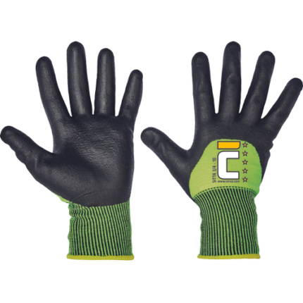 Szyte rękawice Hi-Vis wykonane z mieszanki poliestru i Spandexu wzmacniane syntetyczną skórą w części chwytnej i na koniuszkach palców. W części chwytnej dłoni silkonowy zadruk dla zwiększonej chwytności, neoprenowy mankiet zapinany na rzepy Velcro. Wstawka frotte chłonąca pot na wierzchniej części kciuka.