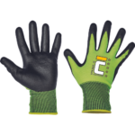 Dziane, bezszwowe rękawice. Odblaskowy kolor zwiększa widoczność użytkownika. W części dłonicowej i na palcach oblane nitrylem, dzięki czemu są olejoodporne. Kompatybilne z zarękawkiem antyprzecięciowym Glareola.