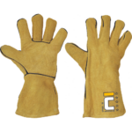 Rękawice z żółtej dwoiny wołowej, z krytymi szwami wykonanymi nicią z kevlaru, bawełniana podszewka, długość 35 cm. Certyfikat – spawalnictwo – EN 12477+A1