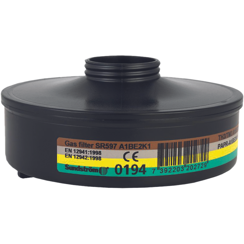 Pochłaniacze SR 597 A1BE2K1 przeznaczone są do stosowania w systemie z wymuszonym przepływem powietrza SR 500/SR 500 EX. W zależności od typu pochłaniacze chronią przed następującymi gazami i oparami: Typ A chroni przed gazami i oparami organicznymi, np. rozpuszczalniki o temp. wrzenia pow. +65 °C. Typ B chroni przed gazami i oparami nieorganicznymi, np. chlor, siarkowodór i cyjanowodór. Typ E chroni przed kwaśnymi gazami i oparami, np. dwutlenek siarki i fluorowodór. Typ K chroni przed amoniakiem i niektórymi aminami, np. etylenodwuamina. Jednostka wentylująca SR 500/SR 500 EX musi być stosowana zawsze z 2 filtrami przeciwpyłowymi lub 2 kombinacjami filtrów i pochłaniaczy.