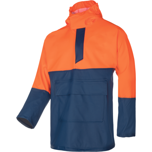 • men's rainproof jacket with fixed hood with peak • closure with touch and close fastening • 1 patched pocket with flap on the front