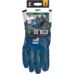 Granatowe rękawice szyte z bawełnianej dzianiny, w całości pokryte nitrylem, sztywny mankiet.
