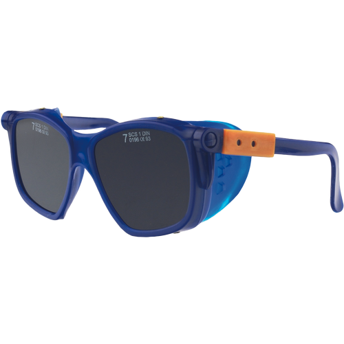 Protective goggles with side covers, adjustable side length and inclination adjustment.