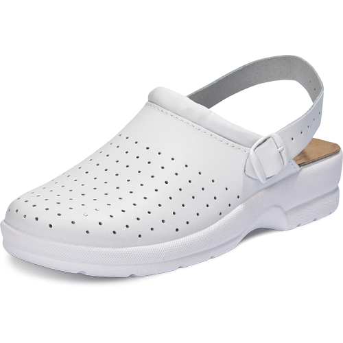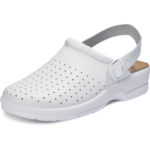 Damskie i męskie klapki z pakiem regulującym na pięcie wykonanym z powlekanej skóry.