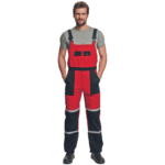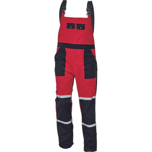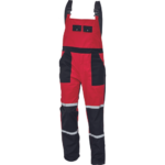 • męskie robocze spodnie ogrodniczki z elastycznym pasem • powłoka wodo- oraz olejoodporna • elastyczne szelki z plastikowymi klamrami • dzielona kieszeń piersiowa z dwiema patkami zapinanymi na zatrzaski • kieszenie wielofunkcyjne, w tym kieszeń na miarkę • dwie kieszenie tylne • elementy odblaskowe – taśmy szerokości 2,5 cm