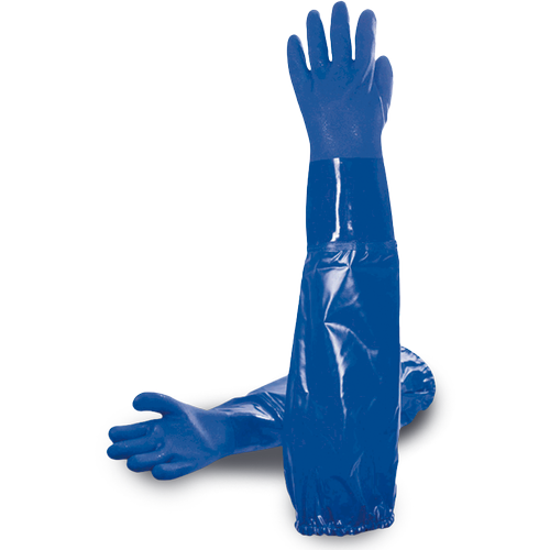 • blue PVC triple dipped glove • seamless cotton liner • thickness: 1.5 mm • total length: 62 cm • petroleum derivatives and Sodium Hydroxide PVC resistant