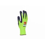 Szyte rękawice Hi-Vis wykonane z mieszanki poliestru i Spandexu wzmacniane syntetyczną skórą w części chwytnej i na koniuszkach palców. W części chwytnej dłoni silkonowy zadruk dla zwiększonej chwytności, neoprenowy mankiet zapinany na rzepy Velcro. Wstawka frotte chłonąca pot na wierzchniej części kciuka.