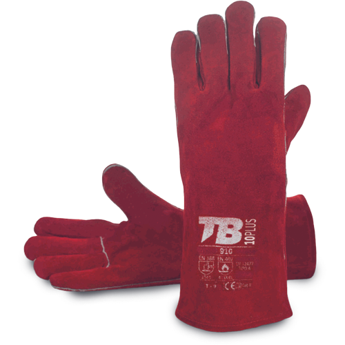 • red cow croupon split leather glove • flannel lining • sewn with para-aramid thread • thickness: 1.2-1.4 mm • total length: 34 cm
