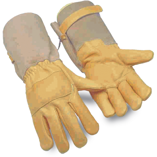 • glove with palm and back made of best quality grain leather • water-repellent and fire-resistant treatment • grain leather reinforcement with water-repellent treatment on back • 16-cm-long split leather safety cuff with water-repellent treatment • sewn with Kevlar® thread • 15 cm Kevlar® cuff • Kevlar® lining on palm • adhesive-strap adjustment on safety cuff