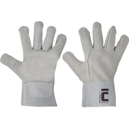 Rękawice ochronne szyte z wysokiej jakości koziej skóry w części chwytnej i bawełnianej dzianiny w części wierzchniej. Opuszki palców pokryte skórą. Mankiety zapinane na rzepy Velcro.