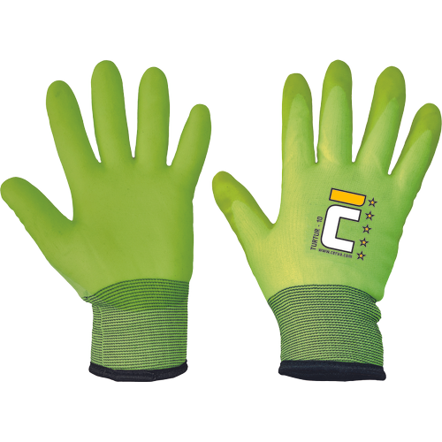 Szyte rękawice Hi-Vis z wodoodporną, oddychającą membraną, wykonane z poliestru z dodatkiem spandexu, w części chwytnej szybkoschnąca, synetyczna skóra z mikrofibry o grubości 0,8 mm, wposażone w piankę redukującą wibracje. W części chwytnej i na palcach zadrukowane wysokiej jakości silikonem. Opuszki palców pokryte syntetyczną skórą. Podszewka poliestrowa. Neoprenowy mankiet zapinany na rzep Velcro. Plastikowy haczyk z oznaczeniem rozmiaru. EN ISO 10819
