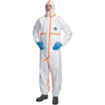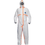 Tyvek® 800 J to odzież chroniąca przed środkami chemicznymi typu 3* o ograniczonym okresie użytkowania która łączy odporność na ciśnieniowe strumienie środków chemicznych na bazie wody z przepuszczalnością powietrza, trwałością i swobodą ruchu. Kombinezon posiada trzyczęściowy kaptur, szyte, klejone szwy. Pętelka na kciuk przy mankiecie. Elastyczne ściągacze wokół twarzy, przy mankietach i nogawkach. Zamek Tyvek® Samoprzylepna klapka pod brodą. Od wewnątrz wykończenie antystatyczne. *Dodatkowe zaklejenie taśmą mankietów rękawów i nogawek, powierzchni wokół otworu kaptura oraz klapki pod brodą jest wymagane do osiągnięcia szczelności na działanie strumienia cieczy (typ 3).