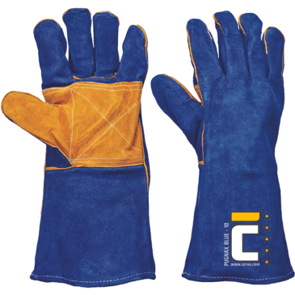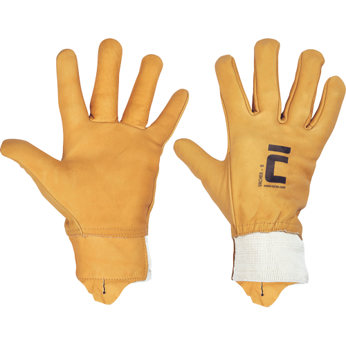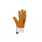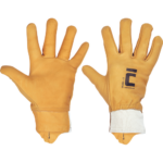 Szyte, wodoodporne rękawice wykonane ze skóry bydlęcej. Mankiet wzmacniany skórą, w górnej części elastyczny ściągacz.