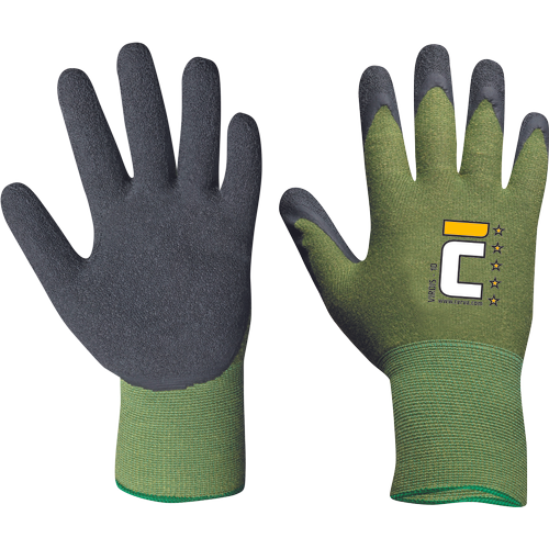 Bezszwowe rekawice z dzianiny, czesciowo pokryte czarnym lateksem, z bambusowym włóknem i marszczeniem na palcach w celu zwiekszenia chwytnosci.