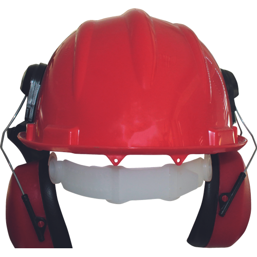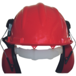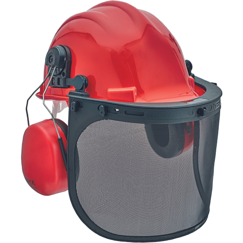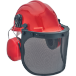 Zestaw dla leśnika składający się z: kasku wykonananego z tworzywa ABS w kolorze pomarańczowym z możliwością regulacji rozmiaru od 55 do 62 cm, z 4 punktami mocowania, więźba z PE, z osłony twarzy wykonanej z siatki oraz z nahełmowych ochronnikow słuchu w kolorze czerwonym – 26 SNR, EN 352-3: 2002. Kask – EN 397: 2012+A1: 2012, ANSI Z89.1