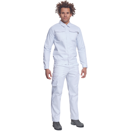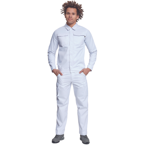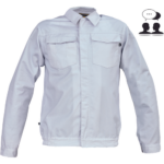 • męska kurtka robocza zapinana na suwak kryty plisą z rzepem • 2 duże kieszenie napiersiowe z patkami • po bokach na dole elastyczne wstawki • mankiety z zapięciem na rzep