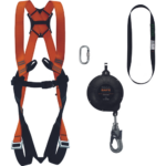 Fall arrest set obsahuje samonavíjecí zachycovač 7 m, postroj, karabinu a smyčku; set je určený pro práci ve výškách pro vertikální a šikmý pohyb