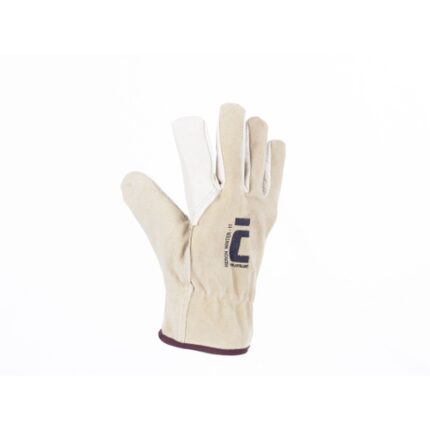 Całoskórzane rękawice ze skóry licowej świńskiej w części chwytnej dłoni oraz dwoiny świńskiej na grzbiecie dłoni.
