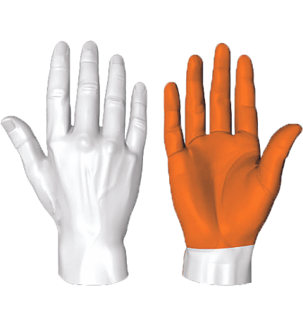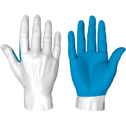 Rękawice z syntetycznej skóry w części chwytnej dłoni i na palcach, z nylonu i Spandexu na jej grzbiecie, z patentową wkładką przeciw przekłuciu i przecięciu w części chwytnej dłoni, palcach i stawach, z poliestrową podszewką i ściąganym mankietem na rzep, można prać w pralce.