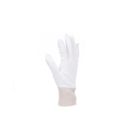 Rękawice ochronne wykonane z drobno dzianej tkaniny będącej połczeniem wybielanej bawełny i poliestru.